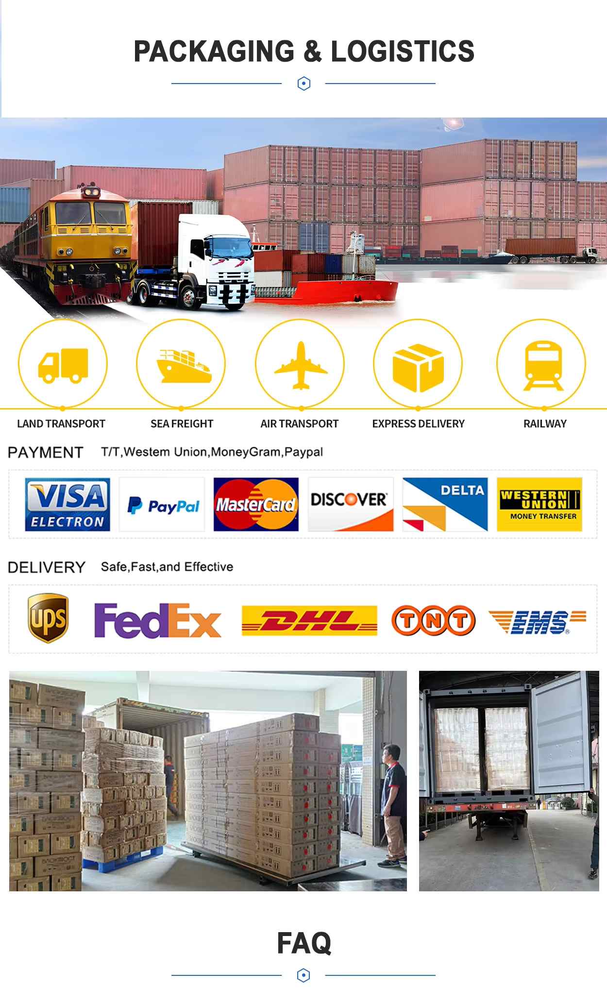 A: มีบริการจัดส่งโดย DHL/FedEx/UPS จะมีหมายเลขติดตามและลิงก์ให้หลังการจัดส่ง ทีมงานของเราจะติดตามกระบวนการทั้งหมดให้ทราบ